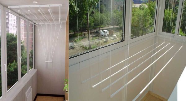 À l'aide de câbles conçus pour une fixation sur une loggia fermée ou un balcon vitré, vous pouvez aller travailler en toute sécurité et ne pas avoir peur de la pluie, qui mouillera les choses. Lorsque les fenêtres de l'appartement donnent sur une chaussée très fréquentée, lorsque vous suspendez des vêtements à l'extérieur des locaux, les vêtements sont saturés de gaz d'échappement et de poussière. Pour cette raison, il est préférable de sécher les vêtements même sur les petits balcons.