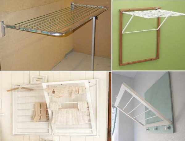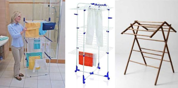 Si pour le moment il n'est pas possible d'installer une structure permanente, un plancher portable fera l'affaire. À l'état assemblé, la structure ne prend pratiquement pas de place. Même les modifications les plus simples sont équipées d'une variété de barres et de crochets, vous permettant de sécher une grande quantité de vêtements.