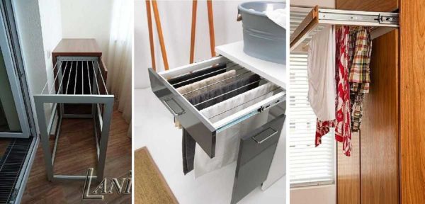 Si vous ne souhaitez pas percer les murs et le plafond du balcon, il est préférable dans ce cas d'utiliser des séchoirs coulissants et pliants. Ils peuvent être mis en place pour sécher les vêtements à tout moment, et après avoir rempli leur fonction, ils peuvent être pliés et placés dans n'importe quel endroit isolé de l'appartement. Alors, familiarisons-nous plus en détail avec le principe de l'appareil de certains de leurs types.