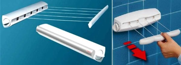 Il y a une corde à l'intérieur. En l'utilisant, nous ajustons la tension et la hauteur, puis bloquons le sèche-linge dans la position ajustée à l'aide d'un élément de blocage spécial. Ce type de construction est l'un des meilleurs pour une utilisation sur un balcon ou une loggia.