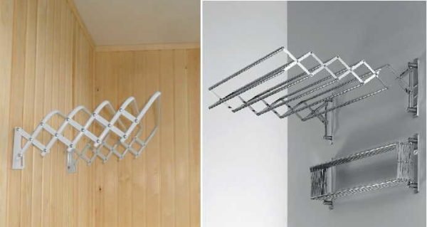 Récemment, les séchoirs muraux en forme d'accordéon ont gagné en popularité. Il s'agit d'une conception de type en porte-à-faux qui se dilate et se rassemble. La largeur maximale en état de fonctionnement atteint environ un demi-mètre. Très compact et facile à utiliser pour les petits balcons. Capable de supporter une charge de 6 à 10 kg.
