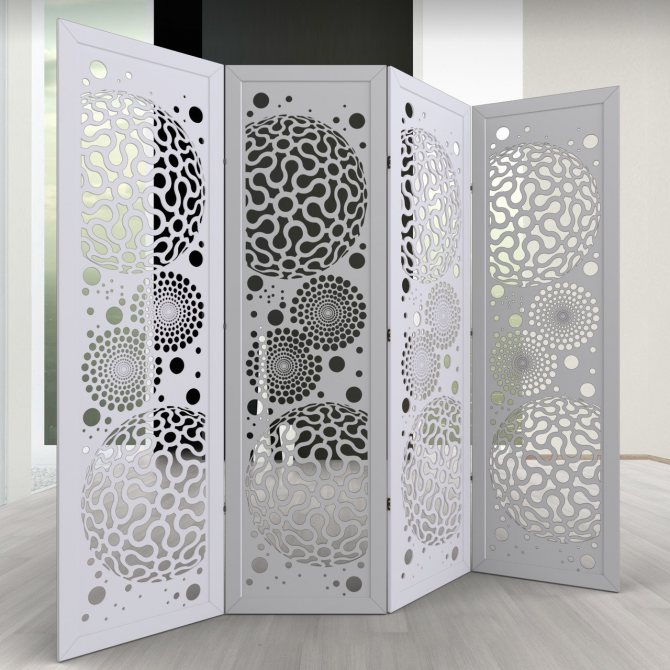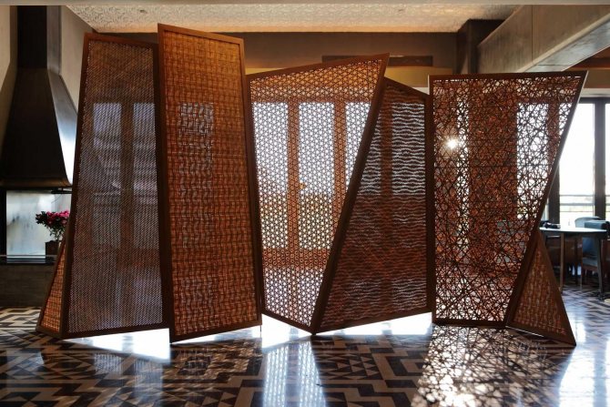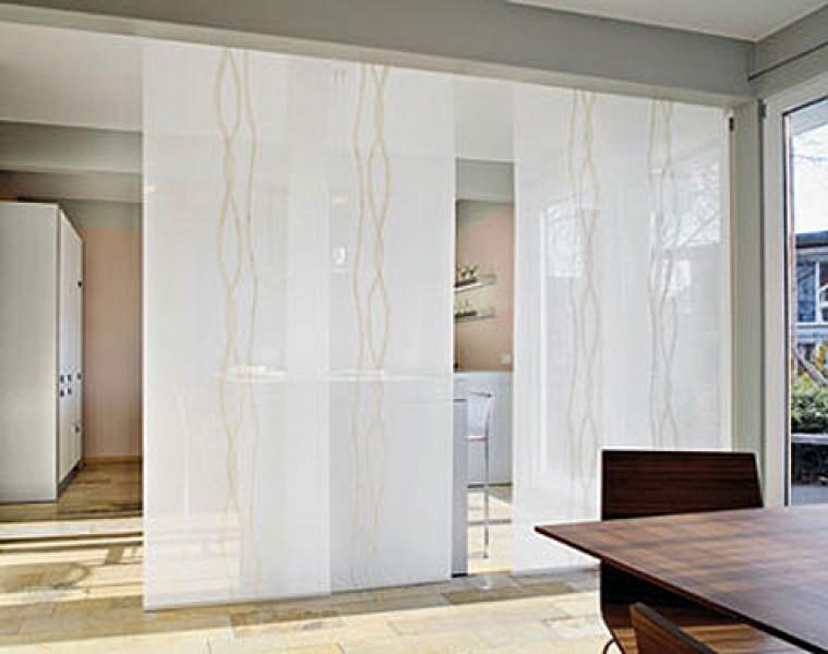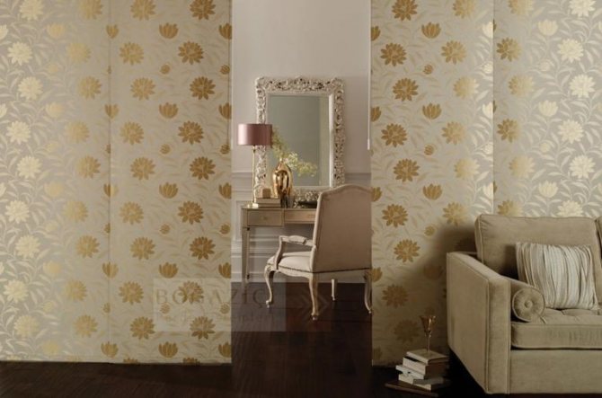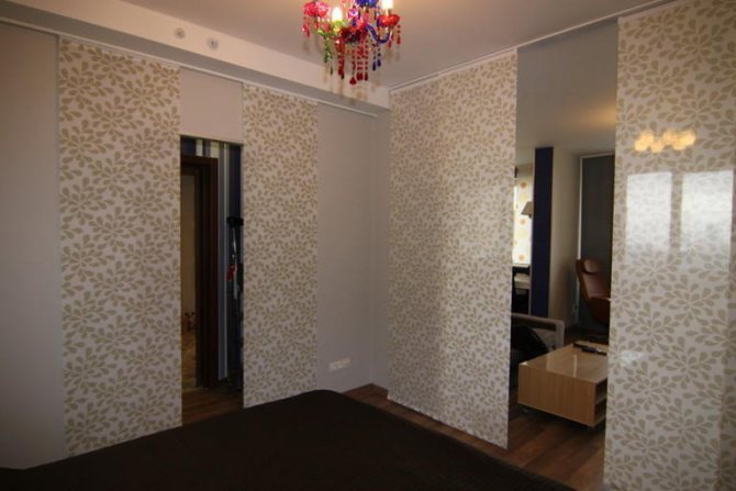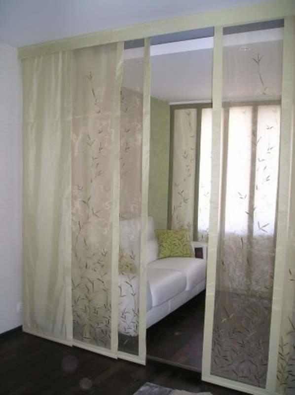 Ils sont composés de plusieurs feuilles de tissu (panneaux). Vous pouvez choisir n'importe quelle densité et couleur du tissu, en fonction de la conception de la pièce et de la façon dont vous voulez voir la cloison: purement symbolique et transparente ou ressemblant à un vrai mur.