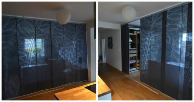 Les stores remplissent principalement des fonctions de camouflage: derrière les toiles se déplaçant le long des rails, vous pouvez cacher des parties disgracieuses de la pièce. Par exemple, avec leur aide, il est facile de cacher un dressing, un garde-manger, un atelier, un espace beauté des regards indiscrets. Le principal avantage de cette méthode est sa grande praticité, surtout si vous choisissez des matériaux en polychlorure de vinyle: ils n'absorbent pas les odeurs et la pollution, ils sont faciles à entretenir, ils sont donc activement mis en œuvre dans les zones adjacentes à la cuisine et à la salle de bain.