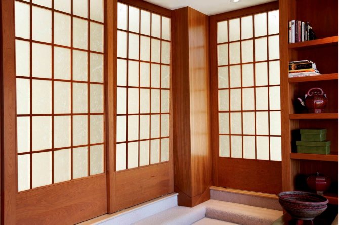 L'un des analogues les plus proches de ces portes est considéré comme une cloison - "fusuma". Ainsi, la partition glisse le long de guides spéciaux. Ces produits sont décorés de papier ou de soie. Souvent, de telles portes et cloisons intérieures de style japonais étaient installées dans de grandes et spacieuses salles.