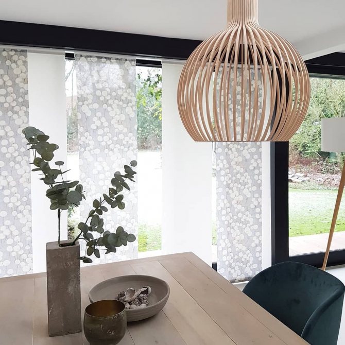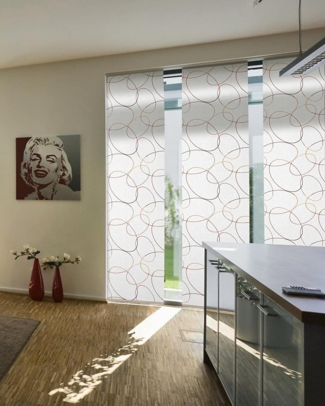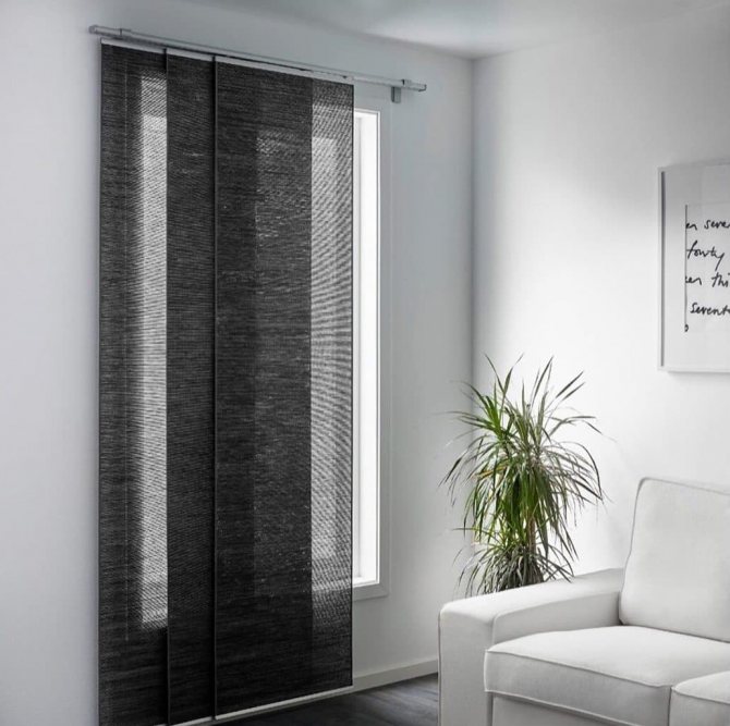 Les connaisseurs de solutions pratiques et laconiques aimeront les stores verticaux: lorsqu'ils sont assemblés, ils prennent un minimum de place et ne frappent pas.