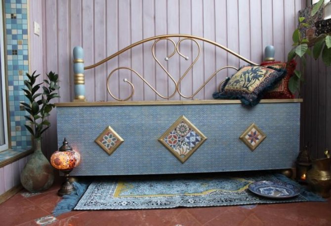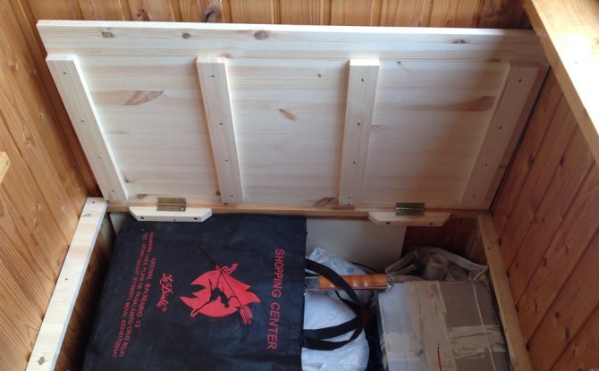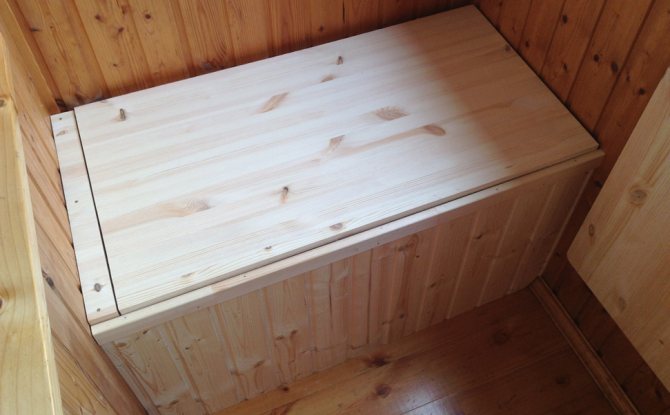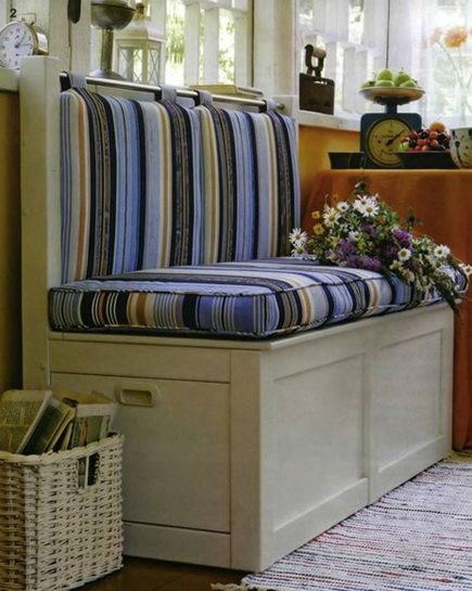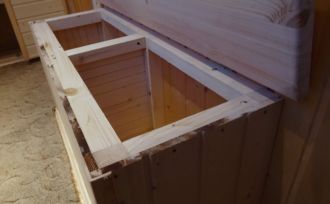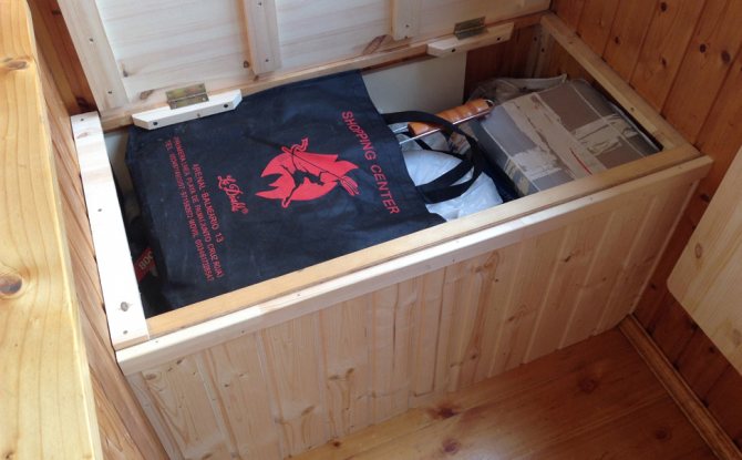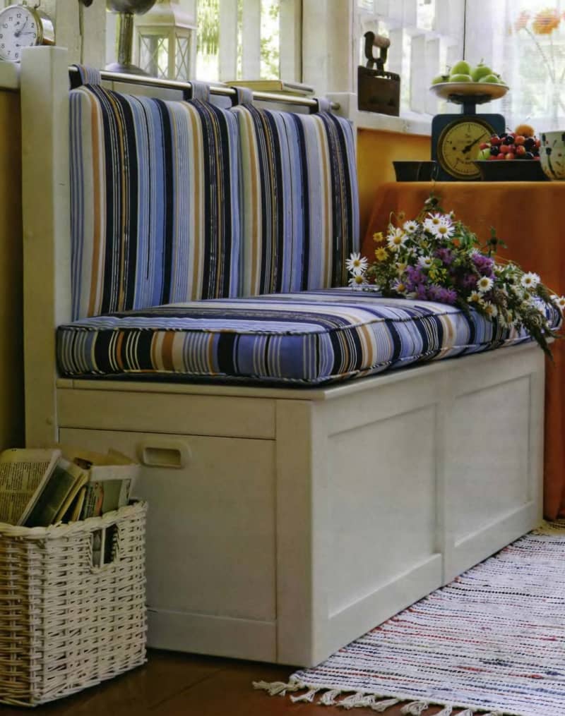 - Banc avec portes. Les portes des armoires peuvent être décorées avec des ferrures de style général. Cette boîte est pratique à utiliser pour conserver les conserves.