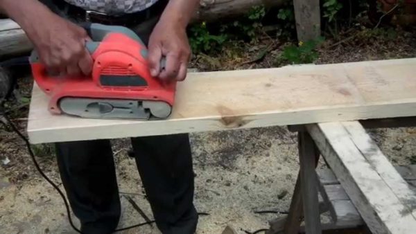 - Pour poncer la surface (si vous avez une planche non traitée), le moyen le plus simple est d'utiliser une ponceuse, elles sont différentes, et dans notre cas, tout fera l'affaire. S'il n'est pas possible de trouver un tel outil électrique, vous pouvez le faire avec une barre avec du papier de verre, le travail prendra plus de temps, mais le résultat ne sera pas pire;