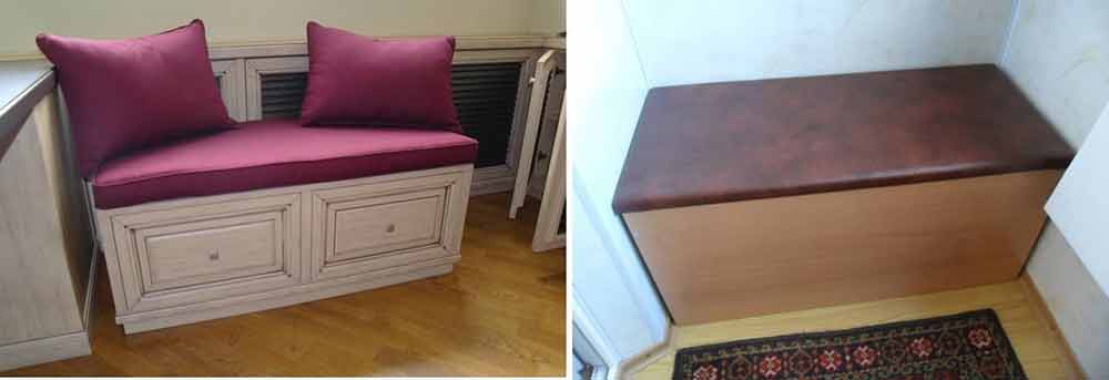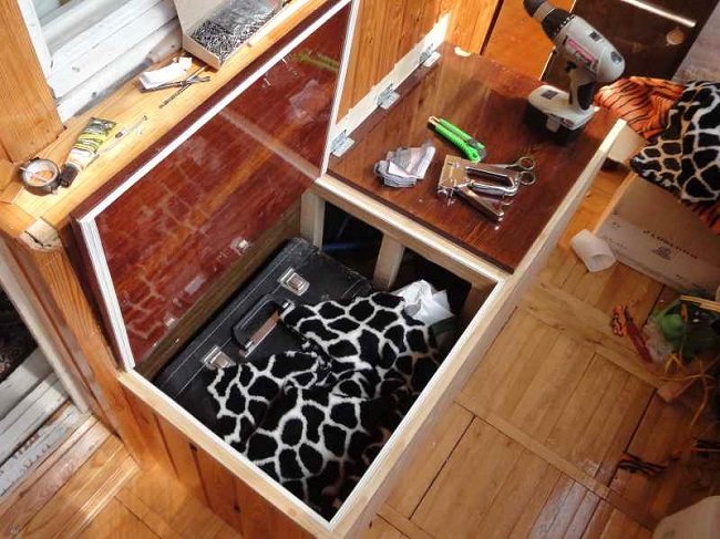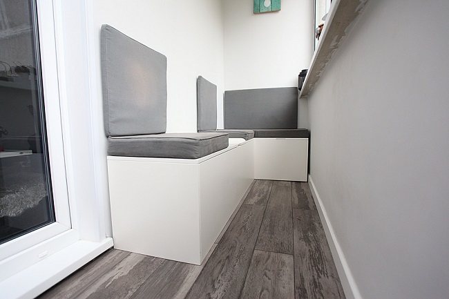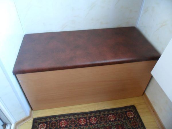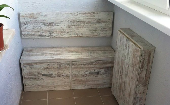 Les casiers intégrés sur les balcons ne conviennent pas à tout le monde. Par conséquent, dans l'établissement suivant, nous avons fabriqué une commode sur laquelle vous pouvez vous asseoir. Le matériau était un panneau de particules stratifié. Le plateau de table avait une épaisseur de 24 mm. Deux énormes boîtes ont été fabriquées à l'intérieur.