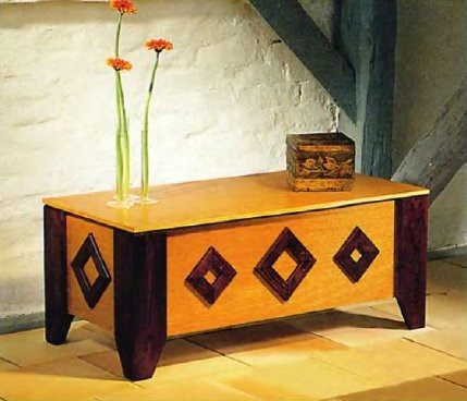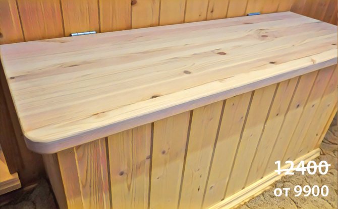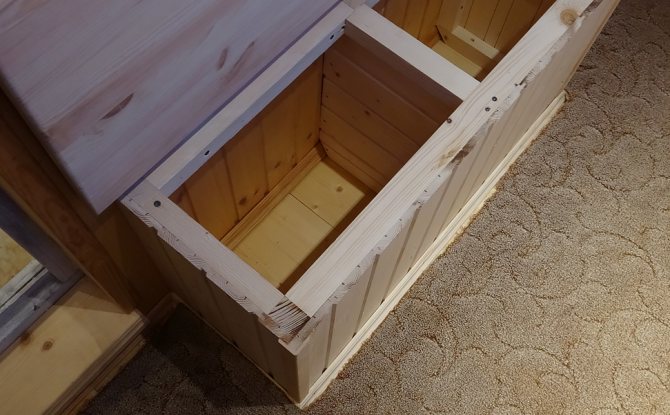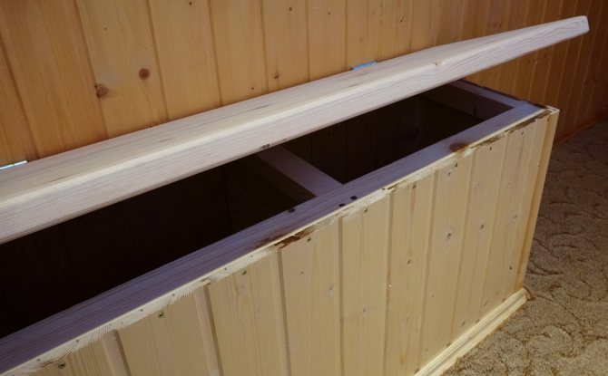 Nous avons fabriqué le couvercle supérieur en bois massif de 18 mm d'épaisseur. Une telle couverture pour le casier s'avère lisse. Il est pratique de déplacer le cinquième point. Un tel coffre est très similaire à une boutique en termes de fonctionnalité.