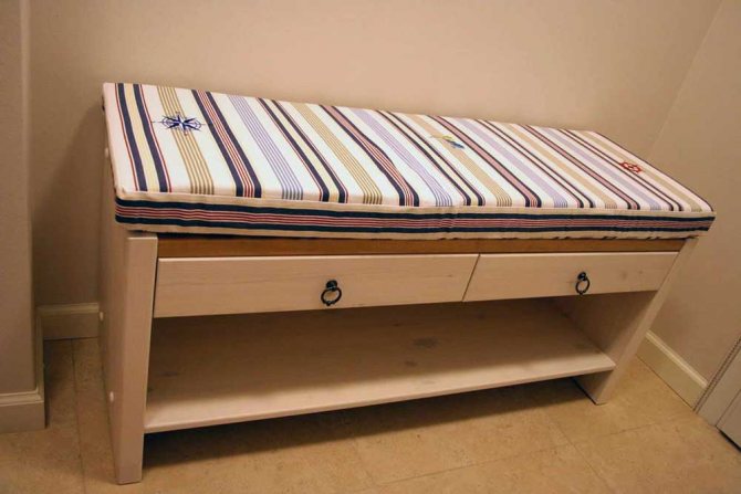 - Banc avec tiroirs. Un tel modèle est équipé d'un type d'étagère ouverte. Le cadre est constitué d'une ou plusieurs cloisons internes divisant l'espace de la boîte. De plus, les tiroirs sont de taille appropriée, qui sont insérés dans les compartiments. Ils doivent être plus petits que les niches elles-mêmes. Dans les articles ménagers, vous pouvez acheter des paniers prêts à l'emploi ou des boîtes en tissu, qui conviennent également à cet effet.