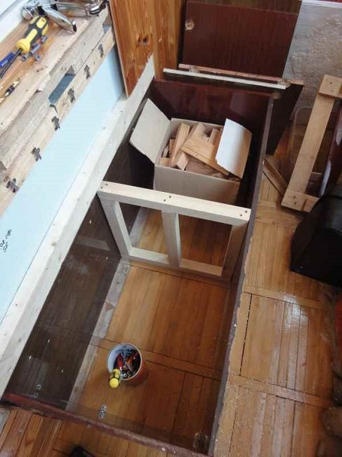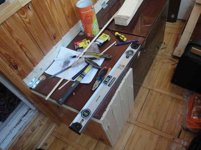 Lorsque nous sommes arrivés à l'objet, nous avons vu le cadre déjà commencé pour le casier.Le client l'a assemblé lui-même - l'affaire était à mi-chemin. Il nous a demandé de recommencer. Ensuite, il y aurait des trous de vieux clous. Par conséquent, People's Windows a proposé un autre plan pour convertir l'ancien casier en un nouveau.