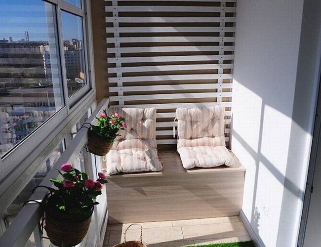 coin repos: Même sur le balcon le plus étroit, il ne faut pas négliger l'occasion de créer un coin de détente personnelle. Du moins selon la version suédoise (un coffre en bois pour ranger des choses + un oreiller - photo-1) ou une chaise longue, qui nous est plus familière.