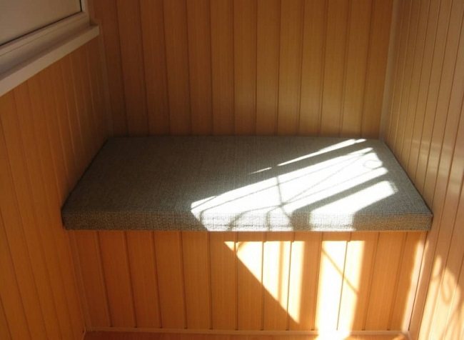 Pour décorer le siège sur le balcon, vous pouvez également utiliser une planche de revêtement ordinaire. Il peut recouvrir tous les côtés du produit et décorer les extrémités avec un film autocollant assorti au revêtement.