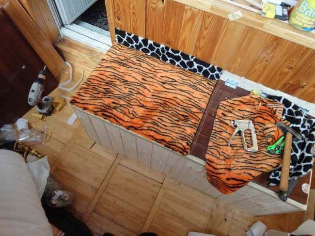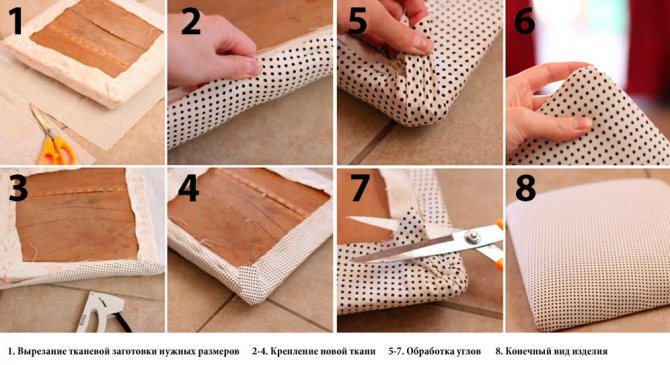 Il est préférable d'utiliser la méthode de rembourrage pour décorer les sièges du balcon. Pour ce faire, vous devez couper le tissu de similicuir et de mousse de polyuréthane à la taille du couvercle de la boîte avec la fourniture et utiliser une agrafeuse pour meubles pour le fixer à l'intérieur du pneu.
