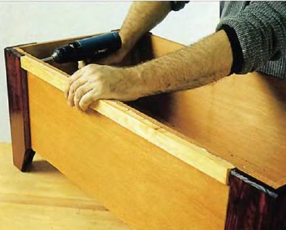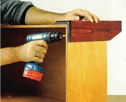 - Nous installons la boîte sur le côté pour le montage des pieds d'angle. Nous réalisons le travail de l'intérieur avec des vis autotaraudeuses. N'oubliez pas de renforcer en plus les articulations avec de la colle.