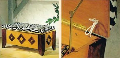 La boîte sera plus confortable pour s'asseoir si vous cousez un matelas moelleux de vos propres mains. Pour ce faire, mesurez les paramètres du couvercle, découpez un morceau rectangulaire similaire de caoutchouc mousse épais. Ensuite, une housse doit être découpée dans le tissu et cousue pour cela. Lorsque vous intégrez les points de suture dans le rembourrage, cousez le matelas en plus. Cela lui permettra de mieux conserver sa forme. Fixez le siège souple au couvercle du coffre d'une manière pratique pour vous. Nous suggérons de percer deux trous dans chaque coin pour enfiler les lacets qui fixent le produit.