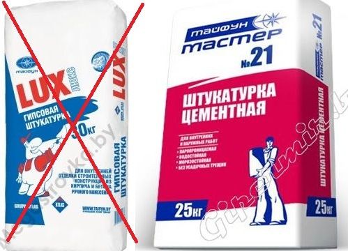 La première règle lors du choix d'un matériau est que vous ne pouvez pas utiliser de plâtre de gypse pour les pentes externes. Jamais au grand jamais. Le problème avec le gypse est qu'il a peur de l'humidité - il aspire l'humidité et s'effrite lorsque la température change.
