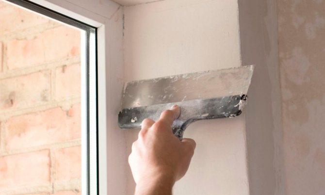 - Ensuite, vous devez amener la surface à un état parfaitement uniforme. Pour cela, vous devez enduire correctement les murs à l'aide d'une spatule spéciale. La solution est appliquée en plusieurs couches, chacune étant frottée. Lors de l'application de la première couche, il sera correct d'installer un coin perforé en plastique autour du périmètre de la fenêtre afin que la pente ait la forme correcte.