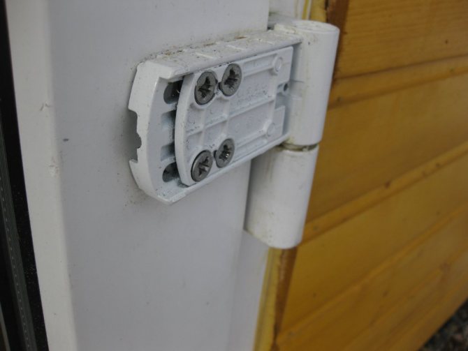 Habituellement, les charnières sont installées sur les portes en plastique à travers un insert en fer (gabarit de charnière), qui est fixé au vantail de la porte à l'endroit où la charnière sera installée. Le gabarit existe uniquement pour la possibilité d'ajuster la position de la porte dans toutes les directions du plan horizontal. Dans le plan vertical, la position du châssis est ajustée en raison du fait que la conception des charnières des portes en métal-plastique comporte à l'extrémité des charnières, cachées sous les capuchons décoratifs, des vis de réglage spéciales.
