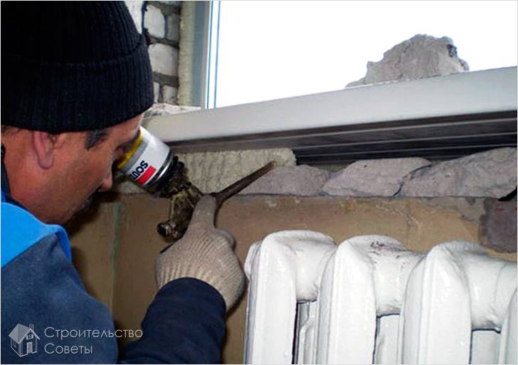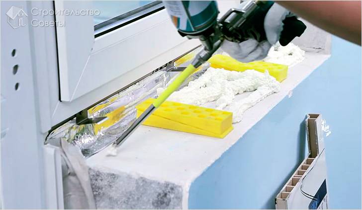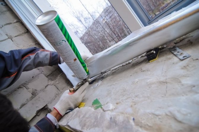 - Après 20 minutes, de la mousse de polyuréthane est appliquée à la jonction du rebord de la fenêtre avec le cadre, puis 7 à 10 kg supplémentaires de charge sont installés sur la structure.