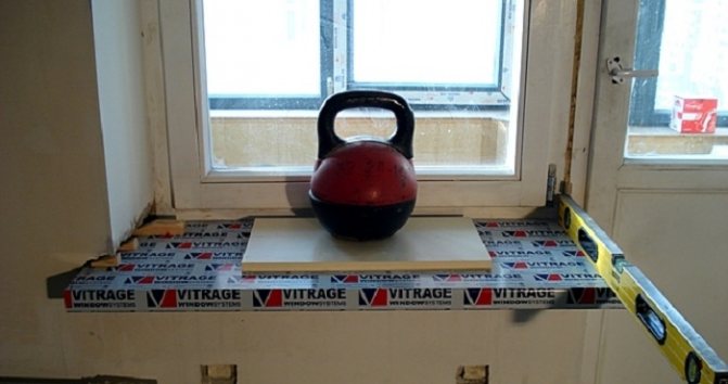 Pour fixer l'horizontale sur la toile, des poids de plusieurs kilogrammes doivent être installés pendant 4 à 5 heures. Ensuite, scellez le joint sous le rebord de la fenêtre avec un mastic acrylique. L'espace sous le rebord de la fenêtre doit être expansé uniformément d'un tiers du rebord de la fenêtre. Lorsque la mousse durcit, la cavité restante doit être remplie d'un mortier préparé à partir du mélange de construction, en l'alignant avec le mur.