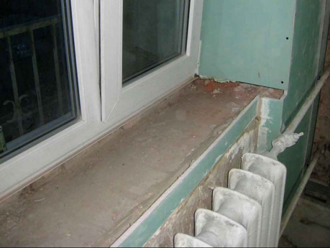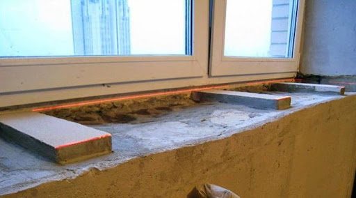 - Préparez l'ouverture elle-même, sur laquelle le rebord de la fenêtre sera installé. Si la hauteur du rebord de fenêtre acheté est inférieure à celle de l'ancien, il est nécessaire de fabriquer une chape en ciment sur la base horizontale. Si le seuil est plus épais, la niche doit être approfondie.