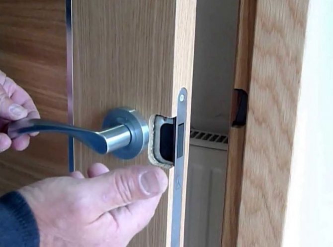 Les loquets, contrairement aux loquets magnétiques, sont équipés d'une languette mécanique. Le but de la languette biseautée est d'empêcher la porte de s'ouvrir par inadvertance. Pour ce faire, il doit tomber dans une rainure de forme spéciale. Si tout est correct, vous entendrez un clic. Pour ouvrir de telles portes intérieures, il suffit de tourner la poignée : le mécanisme s'active, comprime le ressort et libère la languette.