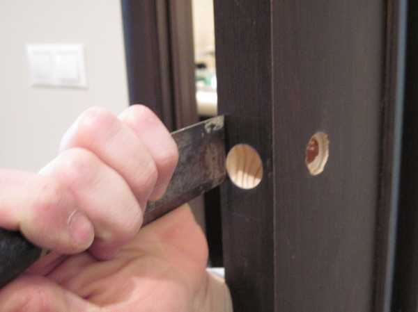 - L'insert du mécanisme lui-même ne diffère pas de l'installation de la serrure. Nous marquons le contour du château avec un crayon et faisons un encart à la profondeur souhaitée. Un ciseau convient pour cela.