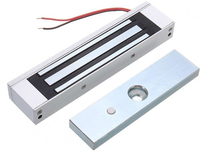 Une bobine ou un enroulement se compose de 300 à 1000 tours de fil de cuivre. Lorsqu'une tension est appliquée, un courant électrique y apparaît, créant un champ magnétique du noyau. En même temps, une plaque métallique est attirée - une ancre, qui maintient la porte fermée. La photo montre un dispositif de verrouillage magnétique.