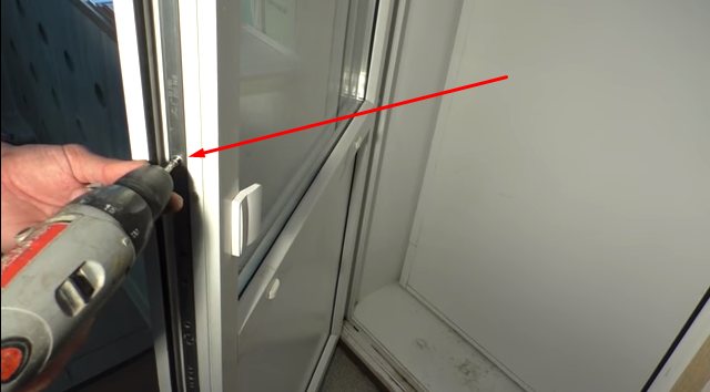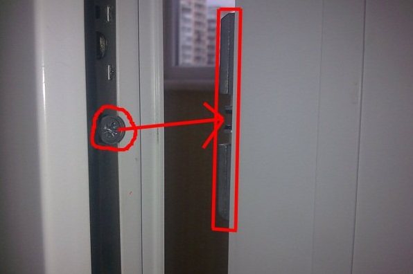 - Avant d'installer le loquet, dévissez la vis autotaraudeuse la plus proche de la poignée principale de l'extrémité du vantail de la porte. Une porte en plastique a tendance à se plier légèrement et si vous placez un loquet en haut ou en bas de la toile, il est possible que la porte doive être poussée pour que le rouleau pénètre dans la partie d'accouplement;
