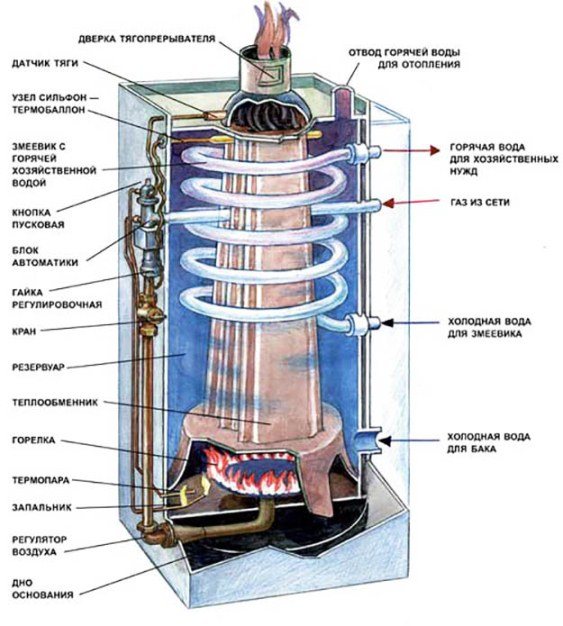 Les chaudières modernes AGV (en décodage - chauffe-eau à gaz automatique) ont bien sûr une conception plus fiable et plus efficace. Le tube de flamme est maintenant divisé en plusieurs sections avec des turbulateurs dans chacune, et une bobine est installée dans la chemise d'eau de l'appareil pour préparer l'eau pour les besoins d'alimentation en eau chaude. Les détails sont clairement visibles dans le diagramme: