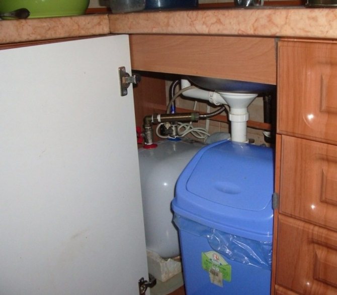 - sous le chauffe-eau, vous pouvez en outre construire ou acheter un support au sol. Elle assurera l'appareil électrique contre les chutes de grande hauteur. De plus, il sera possible d'y ranger les choses nécessaires à la vie quotidienne.