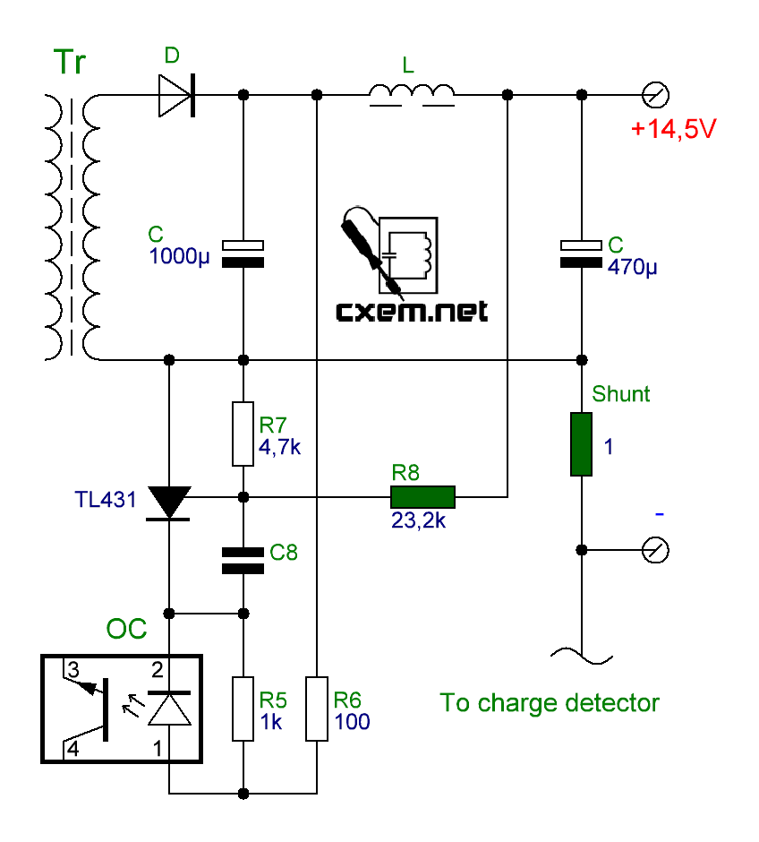 Après avoir libéré la carte et la possibilité de sa rotation libre dans la main, pour inspection et analyse, vous pouvez esquisser la section souhaitée du circuit en indiquant les valeurs nominales des éléments radio installés. Du haut de la carte, le stabilisateur intégral TL431 attire immédiatement l'attention, sur le cerclage dont dépend le niveau de tension de sortie, ou plutôt sa valeur maximale, car sous charge pendant le processus de charge, la tension de sortie s'affaissera en raison de la résistance d'un shunt de faible résistance installé en série :