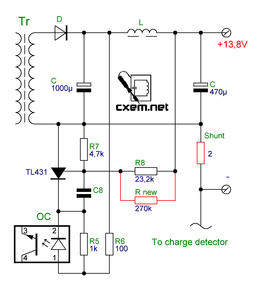 Sur le schéma corrigé, les modifications apportées sont marquées en rouge. Comme déjà mentionné, nous avons installé la résistance shunt avec une résistance de deux ohms, et la nouvelle résistance de 270 ohms ajoutée est indiquée sur le diagramme comme R new:
