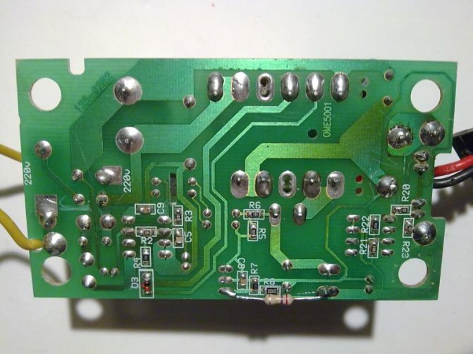 Immédiatement après le démontage, une puissante résistance à faible résistance a été remplacée, car l'ancienne était entièrement carbonisée et émiettée. Au lieu de cela, une résistance bobinée maison d'une telle valeur nominale a été sélectionnée et installée de sorte que le courant de charge au début de la charge ne dépasse pas 1,5 ampères. Les bornes des voyants LED ont également été allongées, car elles n'atteignaient pas les trous du boîtier :