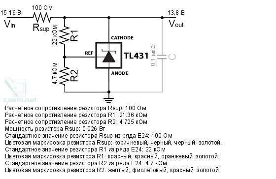 Le site Web Soldering Iron dispose d'un calculateur pour calculer la résistance des résistances de division du stabilisateur TL431 "calculateur TL431". En entrant les données initiales, vous pouvez facilement et simplement déterminer la résistance requise pour certaines caractéristiques.Dans ce cas, il nous est plus facile de choisir l'un des bras diviseurs, à savoir la résistance R8, qui constitue le bras supérieur et a dans l'original une résistance de 23,2 kOhm. Après avoir recalculé les données avec un calculateur pour une tension de sortie de 13,8 Volts, la valeur de la résistance de la résistance spécifiée est de 21,3 kOhm :