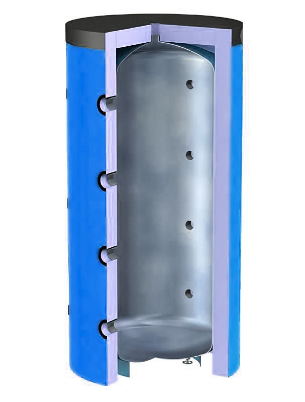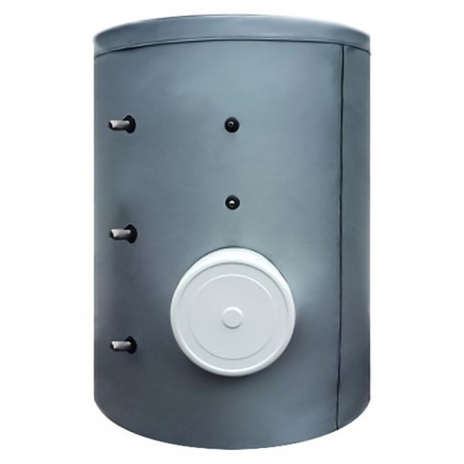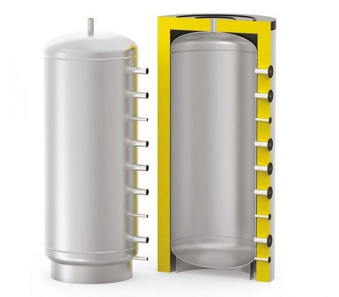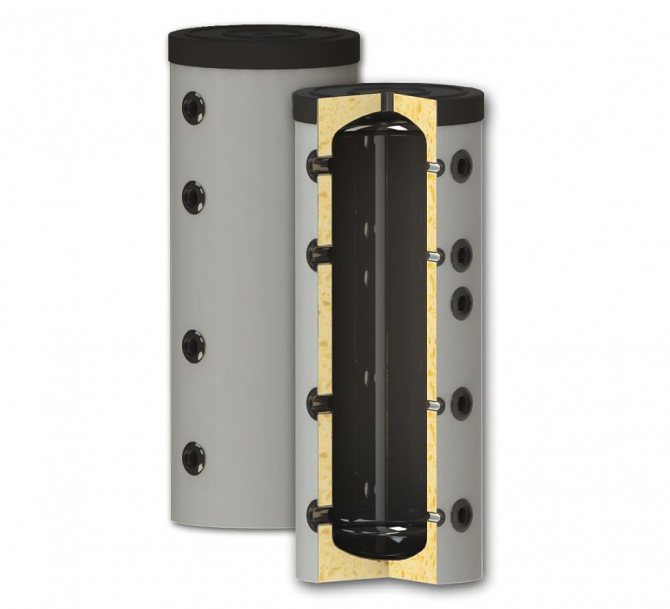 L'accumulateur de chaleur est un réservoir cylindrique vertical scellé, en règle générale, parfois en plus isolé thermiquement. Il est intermédiaire entre la chaudière et les appareils de chauffage. Les modèles standards sont équipés d'un raccordement de 2 paires de buses : première paire - départ et retour chaudière (petit circuit) ; la deuxième paire est l'alimentation et le retour du circuit de chauffage, divorcés autour de la maison. Le petit circuit et le circuit de chauffage ne se chevauchent pas.