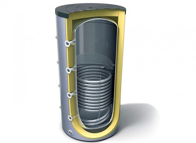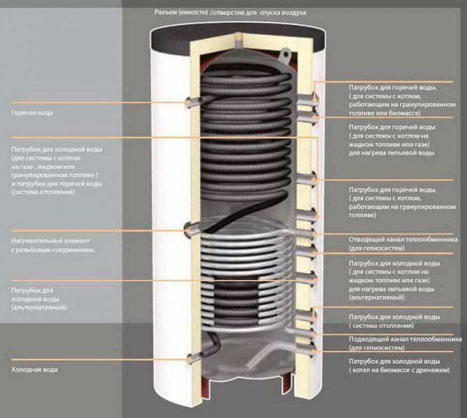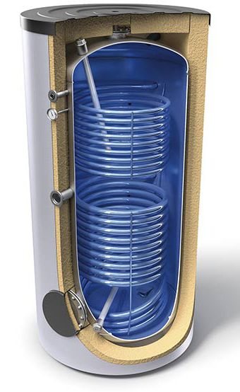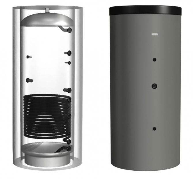 | Ballon tampon avec un échangeur de chaleur interne supplémentaire (généralement sous la forme d'un serpentin). | Un appareil avec un échangeur de chaleur supplémentaire est nécessaire à une pression plus élevée d'un petit circuit, ce qui est inacceptable pour les radiateurs de chauffage. Si un échangeur de chaleur supplémentaire est connecté avec une paire de buses séparée, une (deuxième) source de chaleur supplémentaire peut être connectée, par exemple, chaudière TT + chaudière électrique. Vous pouvez également séparer le liquide de refroidissement (par exemple: eau dans le circuit supplémentaire; antigel dans le système de chauffage) | |