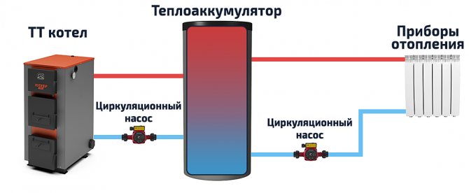 Le plus souvent, le ballon tampon est utilisé avec des chaudières à combustible solide, qui ont une certaine cyclicité, et cela s'applique également aux chaudières TT à longue durée de vie. Après allumage, le transfert de chaleur du carburant dans la chambre de combustion augmente rapidement et atteint ses valeurs maximales, après quoi la génération d'énergie thermique s'éteint, et lorsqu'elle s'éteint, lorsqu'un nouveau lot de carburant n'est pas chargé, elle s'arrête complètement .