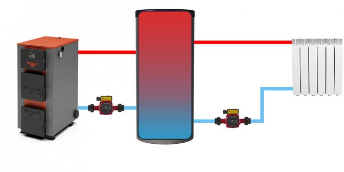 Une pompe de circulation installée entre la chaudière et l'accumulateur de chaleur fournit le caloporteur chauffé à la partie supérieure de l'appareil. L'eau refroidie finira par retourner à l'équipement de chauffage par les tuyaux de dérivation inférieurs. Si nous complétons le système avec une deuxième pompe de circulation et l'installons dans l'espace entre la batterie et les radiateurs, le système fournira un transfert de chaleur uniforme dans tout le bâtiment.