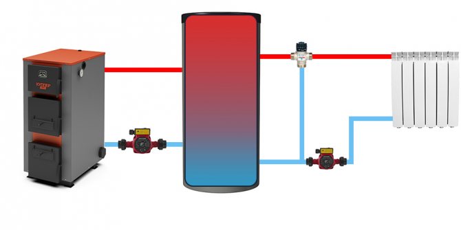 - Après l'allumage de la chaudière, la pompe de circulation pompe en permanence le liquide de refroidissement dans un petit circuit (entre l'échangeur de chaleur de la chaudière et le ballon). L'alimentation de la chaudière est connectée au tuyau de dérivation supérieur de l'accumulateur de chaleur et le retour à celui du bas. Grâce à cela, l'ensemble du réservoir tampon est rempli en douceur d'eau chauffée, sans mouvement vertical prononcé d'eau chaude.