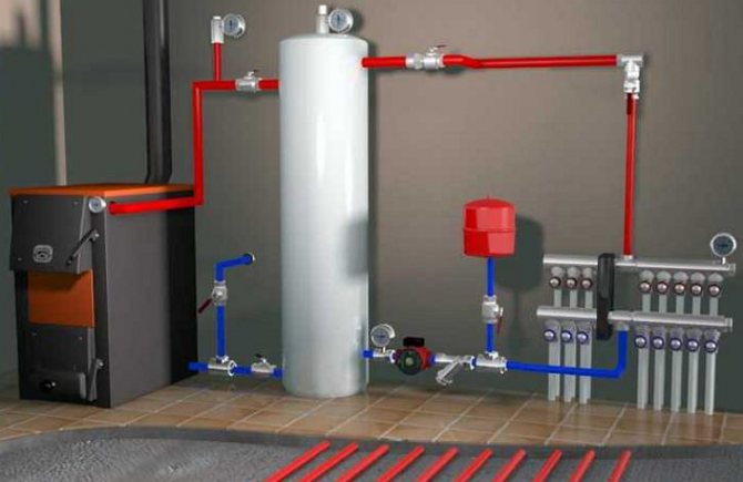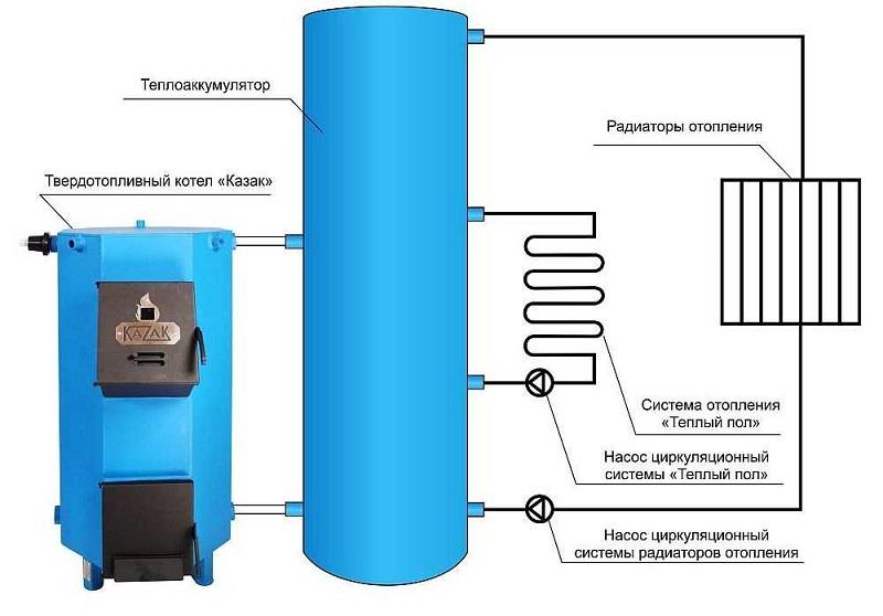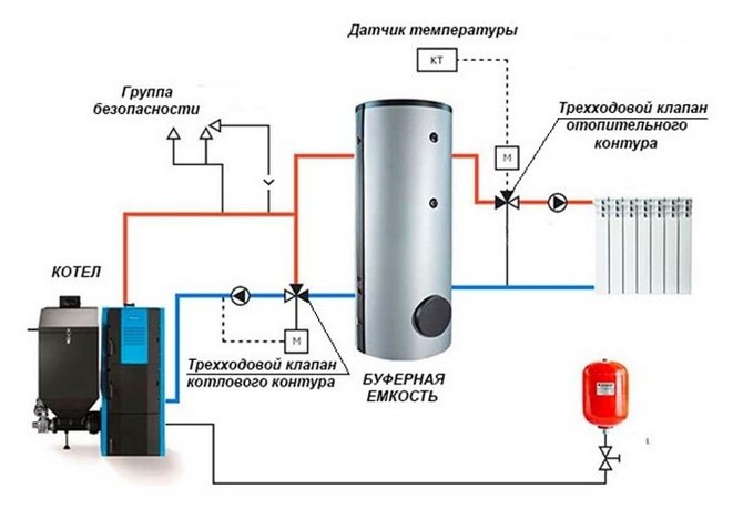 Sur une note: la participation d'un réservoir tampon (accumulateur de chaleur) au fonctionnement du système de chauffage réduit la consommation de carburant de 30 à 50%, selon le type et le type d'équipement de chauffage. Le nombre de charges de combustible dans le four est directement proportionnel au volume de l'accumulateur de chaleur.