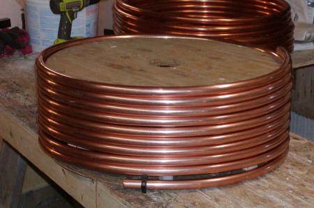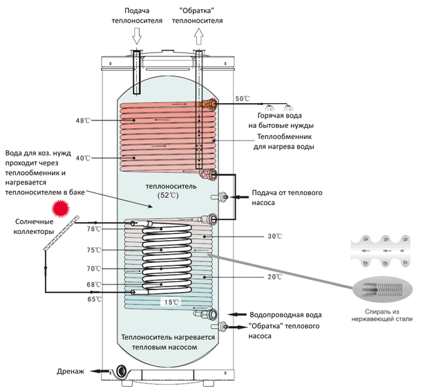 Un tuyau en cuivre d'un diamètre de 2 à 3 cm et d'une longueur de 8 à 15 m est nécessaire, il doit être plié en forme de spirale et placé à l'intérieur du réservoir. Ici, la batterie est le haut du conteneur. Les connexions pour l'eau chaude sortante et l'eau froide entrante sont installées dans le réservoir.