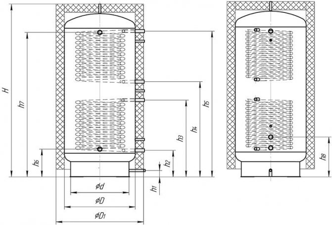 Dans chaque cas individuel, en fonction de la puissance de l'unité de chauffage et des exigences du système de chauffage, le nombre de circuits d'échange de chaleur supplémentaires peut être différent. Le volume requis de l'accumulateur de chaleur est déterminé par de simples calculs, dont nous parlerons plus tard.