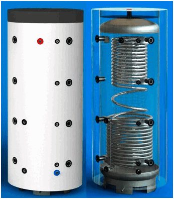 Les accumulateurs de chaleur creux sont les plus simples et ont un faible coût. Ils peuvent être connectés à une ou plusieurs unités. Il est également possible d'installer un élément chauffant supplémentaire fonctionnant à l'électricité. L'accumulateur de chaleur garantit un bon chauffage de l'espace habitable, réduit le risque de surchauffe du caloporteur et assure le fonctionnement sûr du système. L'unité de stockage de chaleur avec une ou deux bobines est un type d'appareil avancé avec une large gamme d'utilisations. L'échangeur de chaleur, situé en haut, recueille l'énergie thermique. Celui du bas chauffe intensément le réservoir tampon.