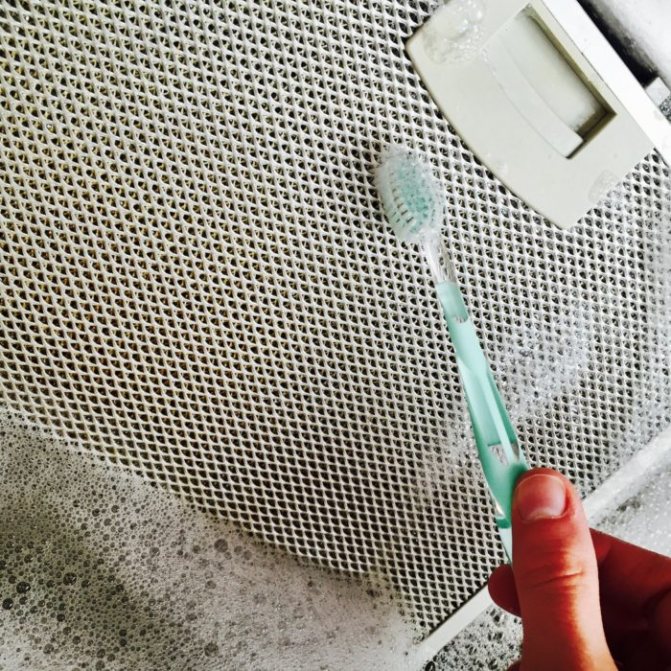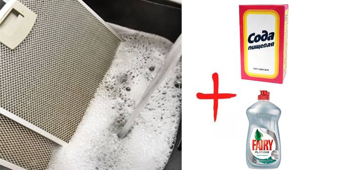 Pour nettoyer la hotte de cette manière, vous devez ajouter 2-3 cuillères à soupe de bicarbonate de soude à la recette précédente. Sous l'action de deux nettoyants, la graisse est rapidement imbibée et éliminée de la surface de la maille. La méthode prend plus de temps que d'utiliser, par exemple, des agents de rinçage de tuyaux, mais plus facile que d'utiliser un seul savon à lessive.