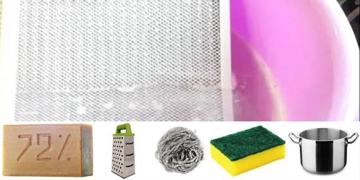 Pour nettoyer la hotte de la cuisine de la graisse qui s'est accumulée récemment, du savon à lessive ordinaire vous aidera. C'est l'un des produits les plus écologiques et non allergènes. Pour travailler, vous avez besoin d'une solution savonneuse. Il est composé de 5 litres d'eau chaude et d'un pain de savon. Pour que le savon se dissolve bien et rapidement, il est frotté sur une râpe grossière ou les morceaux sont trempés dans l'eau à l'avance, puis chauffés. Le treillis est plongé dans la solution et y est conservé pendant au moins une demi-heure. Un nettoyage supplémentaire est effectué avec une brosse ou une éponge ménagère.