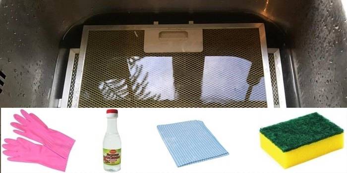 Pour éliminer la suie et la graisse, une solution de vinaigre à 9% est prise. Un chiffon ou une éponge y est humidifié, puis toute la maille du filtre est essuyée. Pour éviter que la solution ne se dessèche, il est conseillé de recouvrir toute la surface avec le même chiffon. Après 10 à 15 minutes, vous devez laver la contamination éliminée avec de l'eau. Si l'ancienne plaque n'est pas partie la première fois, la technique est répétée. Malgré la faible concentration, le vinaigre nécessite l'utilisation de gants.