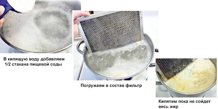 Cette méthode domestique populaire est également utilisée lorsque vous avez juste besoin de nettoyer la hotte. Vous n'avez même pas besoin de frotter quoi que ce soit de la surface. Versez de l'eau dans une grande casserole ou un bol, portez-la à ébullition et versez du soda (verre de 10 litres). Le gaz est réduit au minimum pour que le liquide ne bout pas beaucoup, car la solution de soude a l'habitude de "s'écouler" du récipient. Les filtres sont placés dans une casserole. Lorsque la grille est complètement exempte de saleté, elle est retirée avec des pinces et lavée.