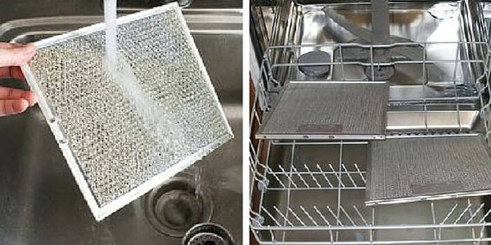 C'est l'un des moyens les plus simples de nettoyer la hotte. Mais seuls ceux qui possèdent un lave-vaisselle peuvent le choisir. Mais même si cette technique est disponible, elle ne fonctionne pas toujours. Une couche de graisse trop grande et trop ancienne n'est pas lavée lors d'un lavage automatisé. Pour éliminer la contamination fraîche du filtre, définissez un mode avec une durée maximale et une température de 60 degrés. Un cycle de lavage suffit généralement.